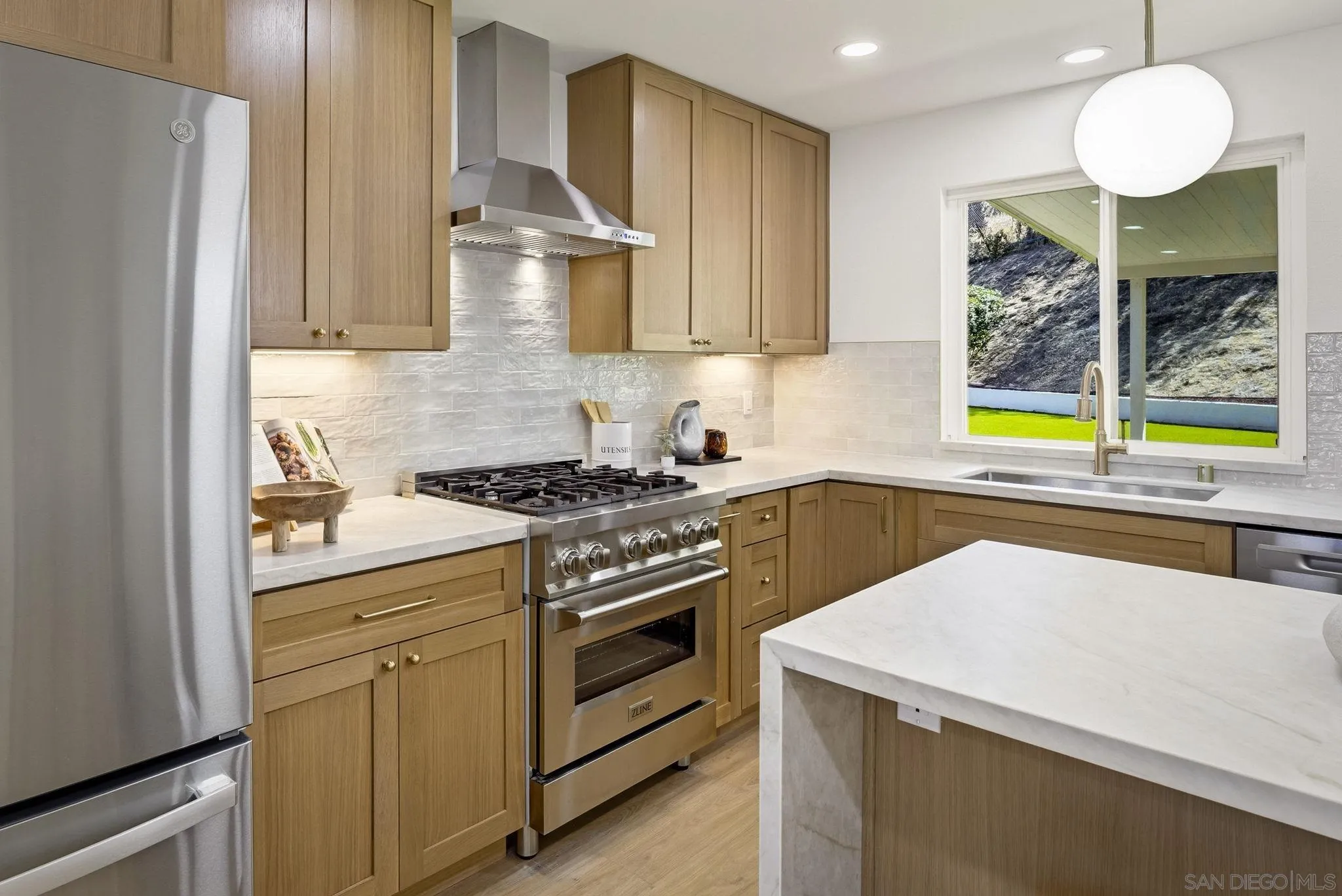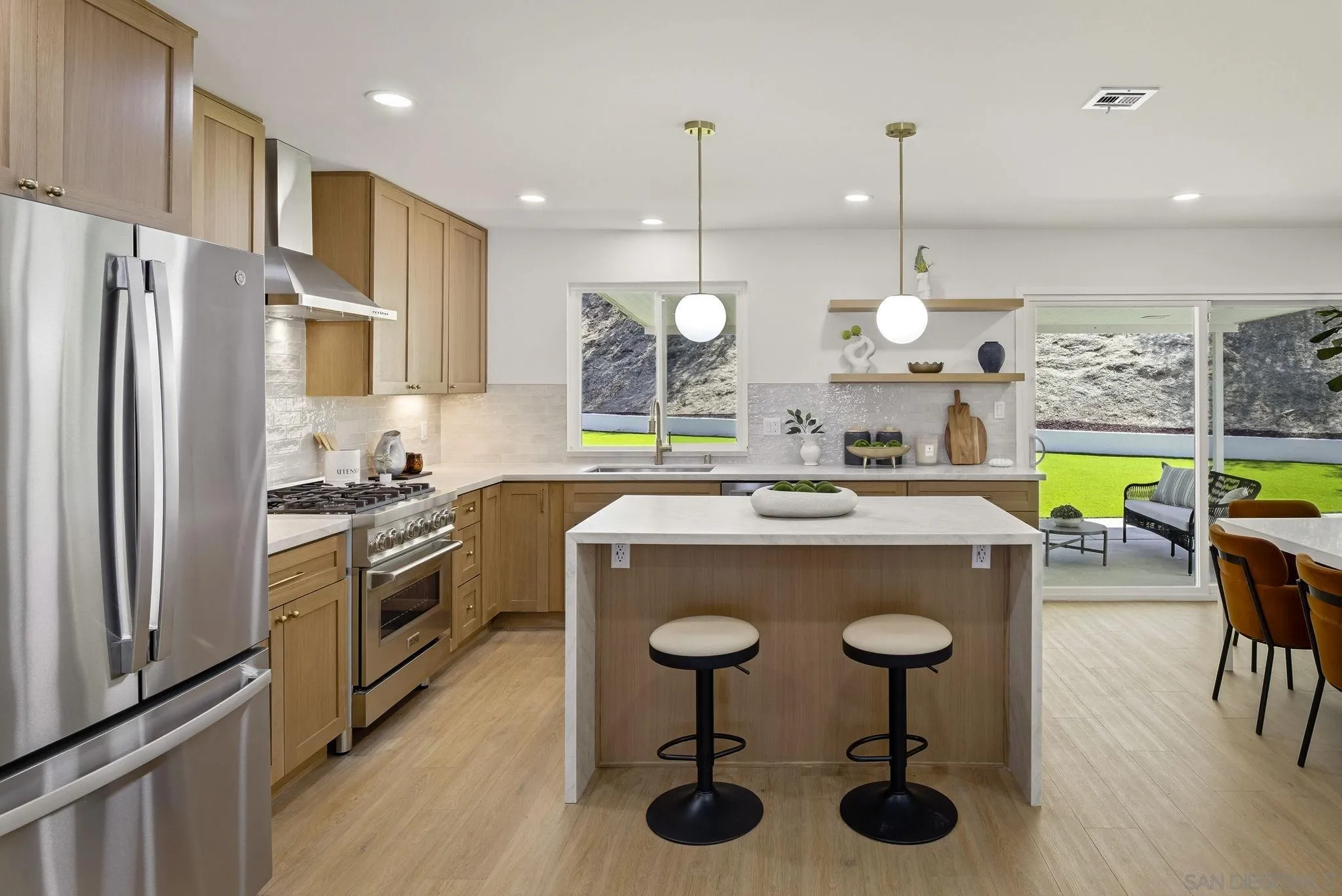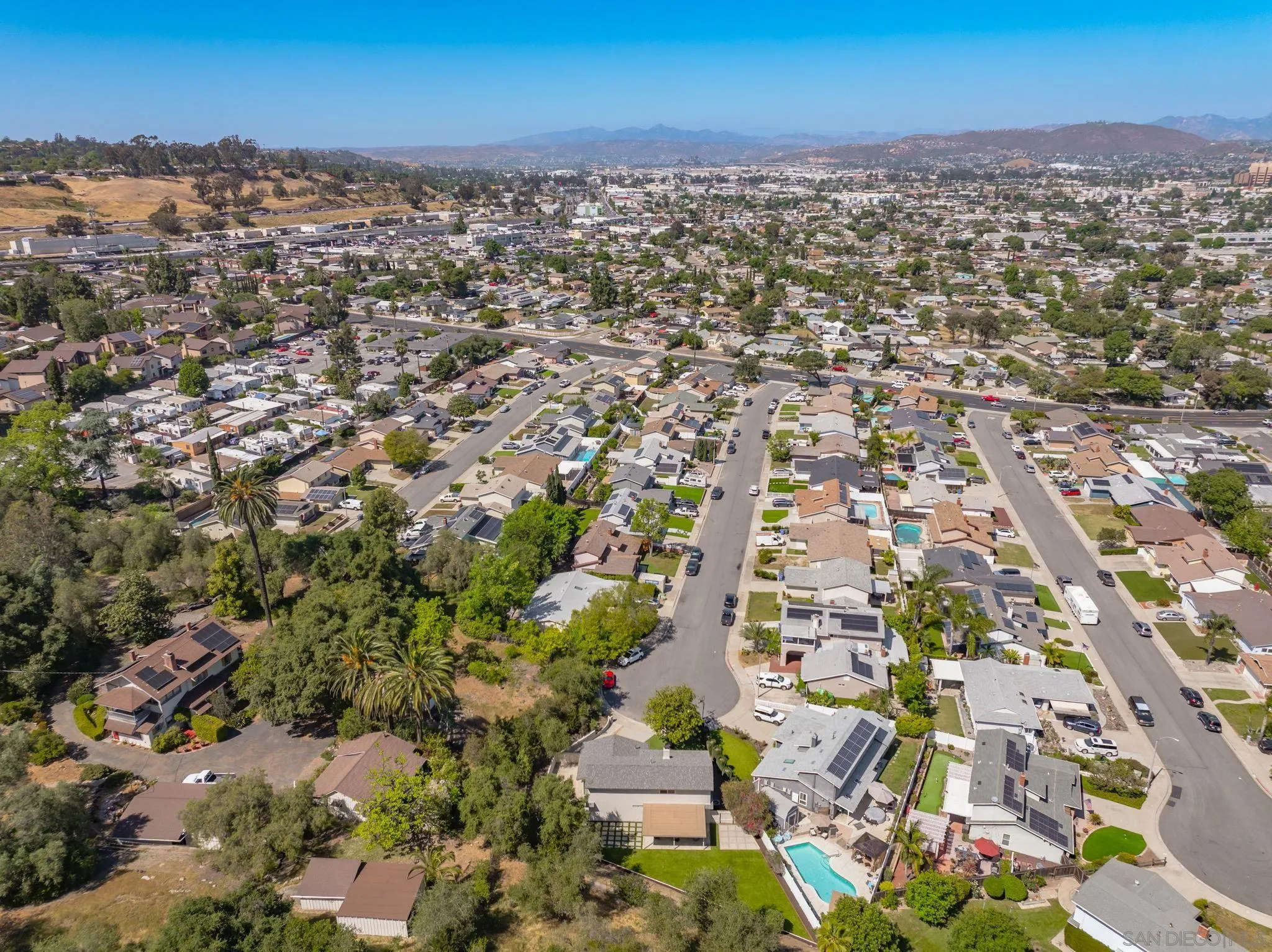 Welcome to one of the most exceptional homes on the street - an exquisitely remodeled residence at the end of a premier cul-de-sac, offering privacy and sweeping views of the Mt. Helix foothills. Set on an expansive 9,500 sq ft lot, this property delivers impressive space both front and back, ideal for entertaining and everyday living. This 4-bedroom, 2.5-bath home spans 1,870 sq ft and features a desirable main-level primary suite. The stunning, fully remodeled kitchen showcases sleek finishes and premium ZLINE and GE appliances, designed with entertaining in mind. Upgrades throughout include new flooring, baseboards, modern lighting and fixtures, fresh interior and exterior paint, and beautifully remodeled bathrooms. The spacious, newly turfed backyard offers endless potential, while the extra-wide 2-car garage and generous driveway provide ample parking. A true statement home combining modern style, functional living, and a coveted location.