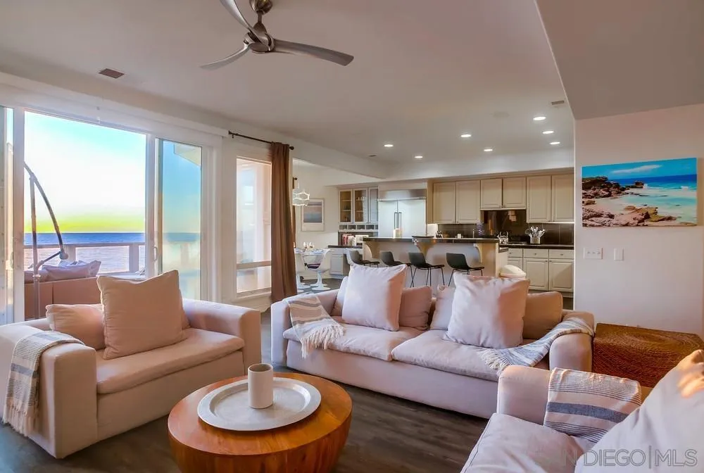 Experience unobstructed ocean and sunset views from this bright, spacious oceanfront residence in the heart of Encinitas. Designed for effortless coastal living, the open floor plan is filled with natural light and ideal for both everyday comfort and entertaining. The main level features soaring ceilings and a seamless flow between the living room, dining area, game room, and kitchen. A gas fireplace anchors the living room, where expansive picture windows frame sweeping ocean vistas. The kitchen offers a large island with bar seating, dual ovens, built-in refrigerator and microwave, abundant cabinetry, and direct sightlines to the oceanfront patio. The dining area enjoys dramatic water views, creating a stunning backdrop for gatherings. Upstairs, the private oceanfront primary suite serves as a retreat with fireplace, sitting area, and walls of glass capturing panoramic coastline views. The spa-inspired bath includes dual vanities, soaking tub, and separate shower. An expansive private deck spans the width of the home, while an adjacent den provides flexible space for an office, media room, or lounge. Outdoor living shines with two oceanfront patios designed for relaxation and entertaining, a landscaped grassy yard, private gated entry, and upper and lower seawalls enhancing coastal frontage. Ideally located near Stonesteps Beach, downtown Encinitas, Encinitas Ranch Golf Course, and convenient freeway access, this is a rare opportunity to own a premier oceanfront property in a coveted coastal setting.